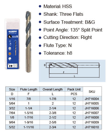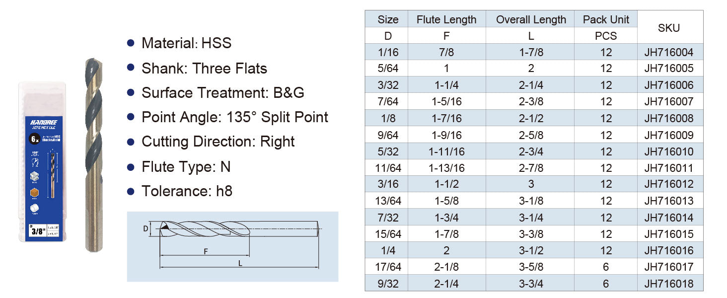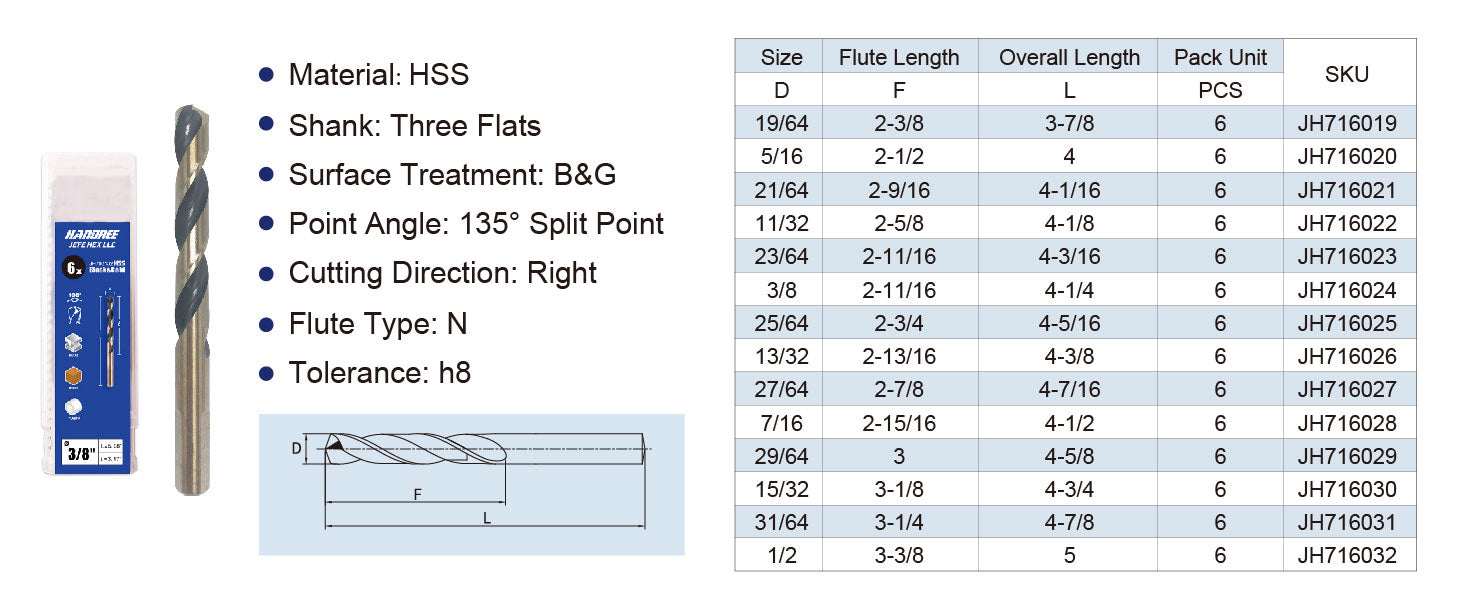 Handree Mechanic Length Drill Bits, HSS, 135 Degrees Split Point, Round Shank, Black & Gold Finish