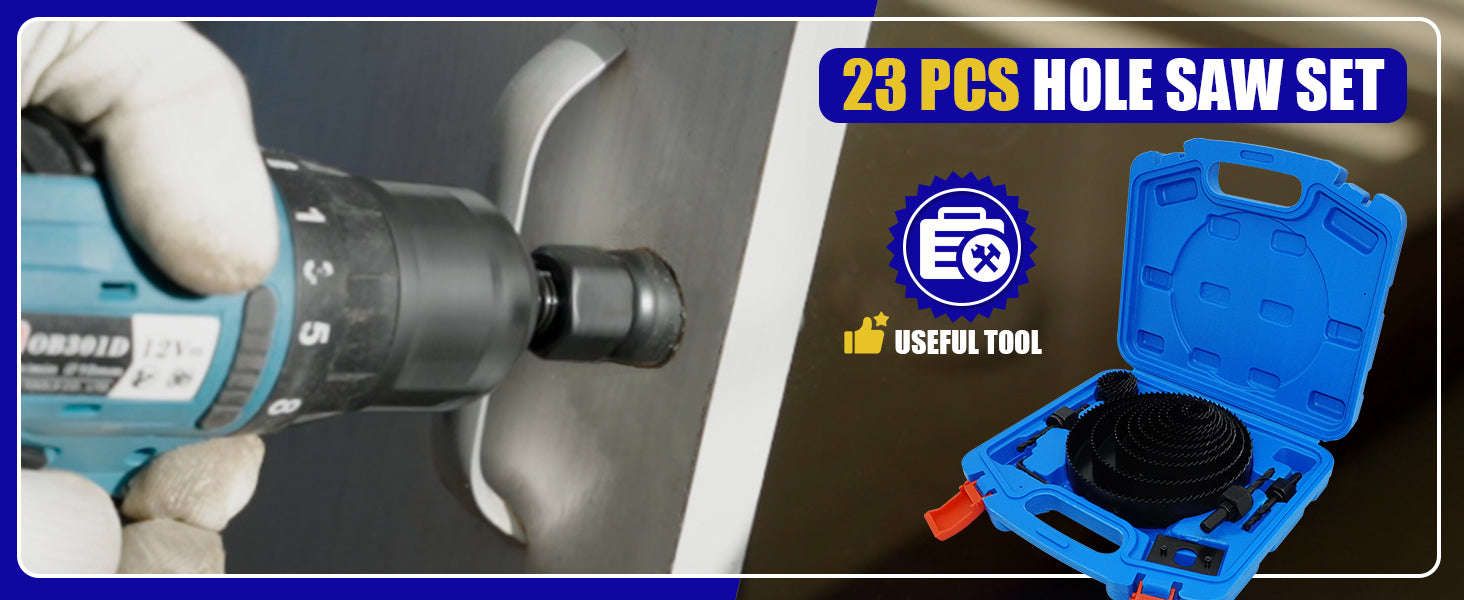 Package Includes: 13pc hole saws: 3/4", 7/8", 1-1/8", 1-1/4", 1-1/2", 1-3/4", 2-1/8", 2-1/2", 3", 3-1/2", 4", 5", 6"; 1/4" Hex Shank; 3/8"&1/4" Three Flats Shank Center Drill; Hex Key; 2pc Adaptor Plate with plastic box.