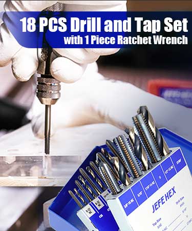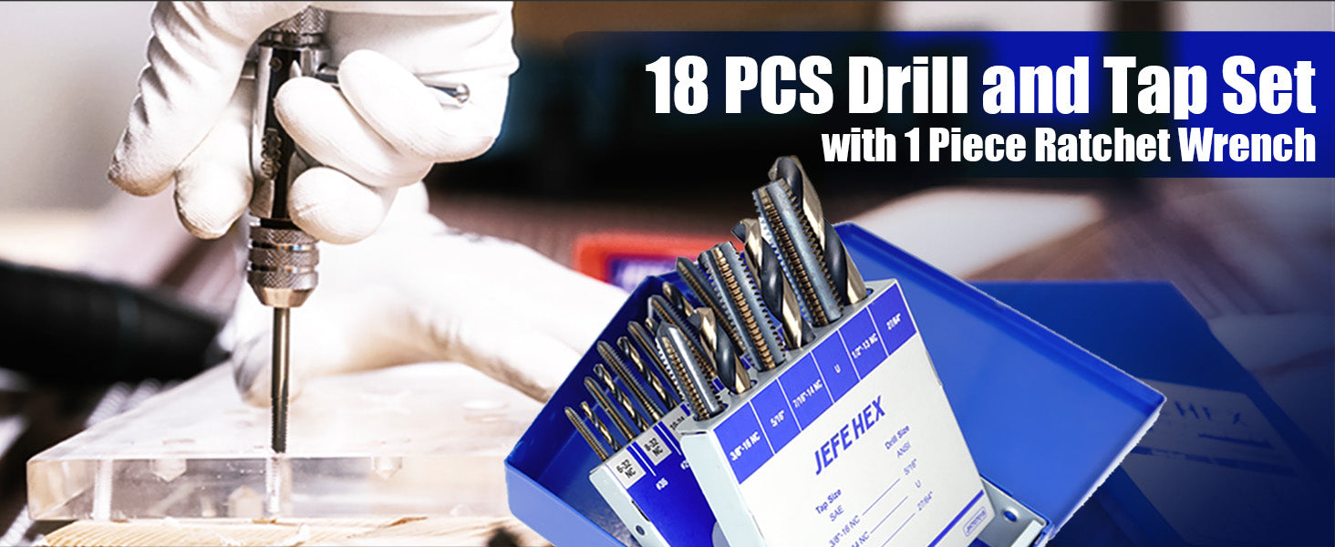 - Drill, Tap and Ratchet Tap Wrench Set Includes: 9 drill bits include wire gauge sizes #36, #29, #25, #21, #7, letter sizes F, U and inch sizes 5/16", 27/64". 9 hand taps include 6-32 UNC, 8-32 UNC, 10-24 UNC, 10-32 UNF, 1/4"-20 UNC, 5/16"-18 UNC, 3/8"-16 UNC, 7/16"-14 UNC, and 1/2"-13 UNC. 1 ratchet tap wrench fits 0-1/4" tap. The set has a strong and professional box with indexed holder and standing up tiers for easy storage and pickup.