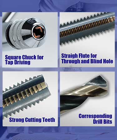 - Wide Applications: The tap and tap wrench are designed to make shallow cuts in narrow spaces. The drill and tap combo are tailored for industrial production, maintenance or portable drilling jobs in metal, aluminum, and plastics.